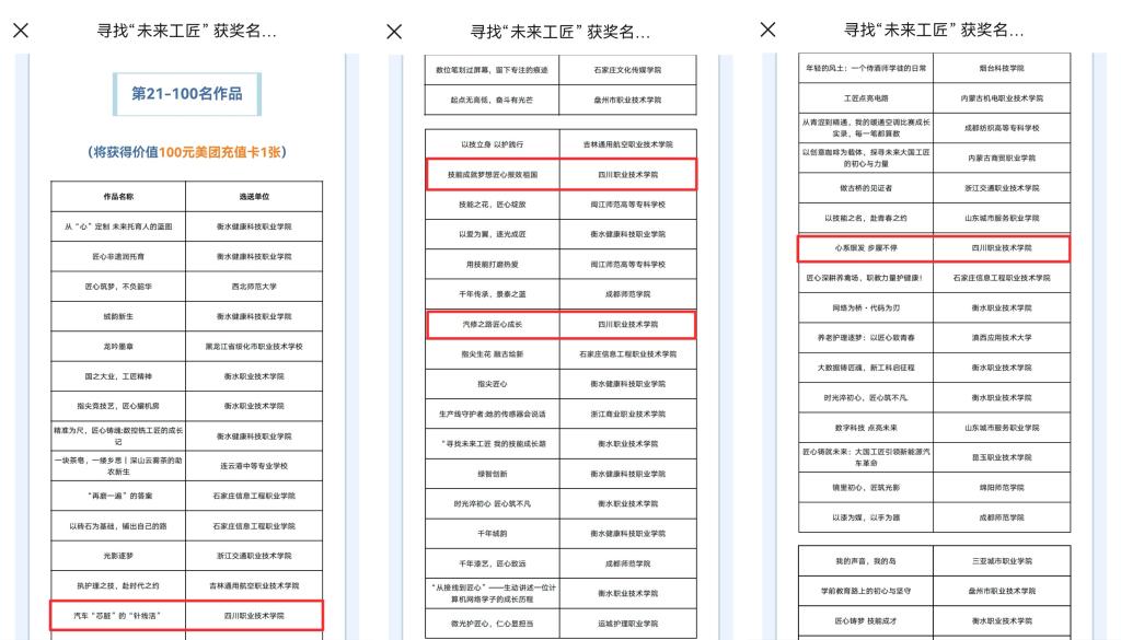 2025年12月31日,由中国教科文卫体工会全国委员会、工人日报社、中工网联合主办的“寻找未来工匠”视频征集活动获奖名单正式揭晓。我校凭借出色的组织动员能力和高质量的参赛作品,荣获“优秀组织奖”,同时全校共有4件参赛视频作品在此次全国2214个参赛视频中脱颖而出、斩获佳绩,其中,3件作品来自汽车学院,1件作品来自卫生健康学院,充分展现了我校在技术技能人才培养领域的扎实成果和学子们昂扬向上的工匠精神。